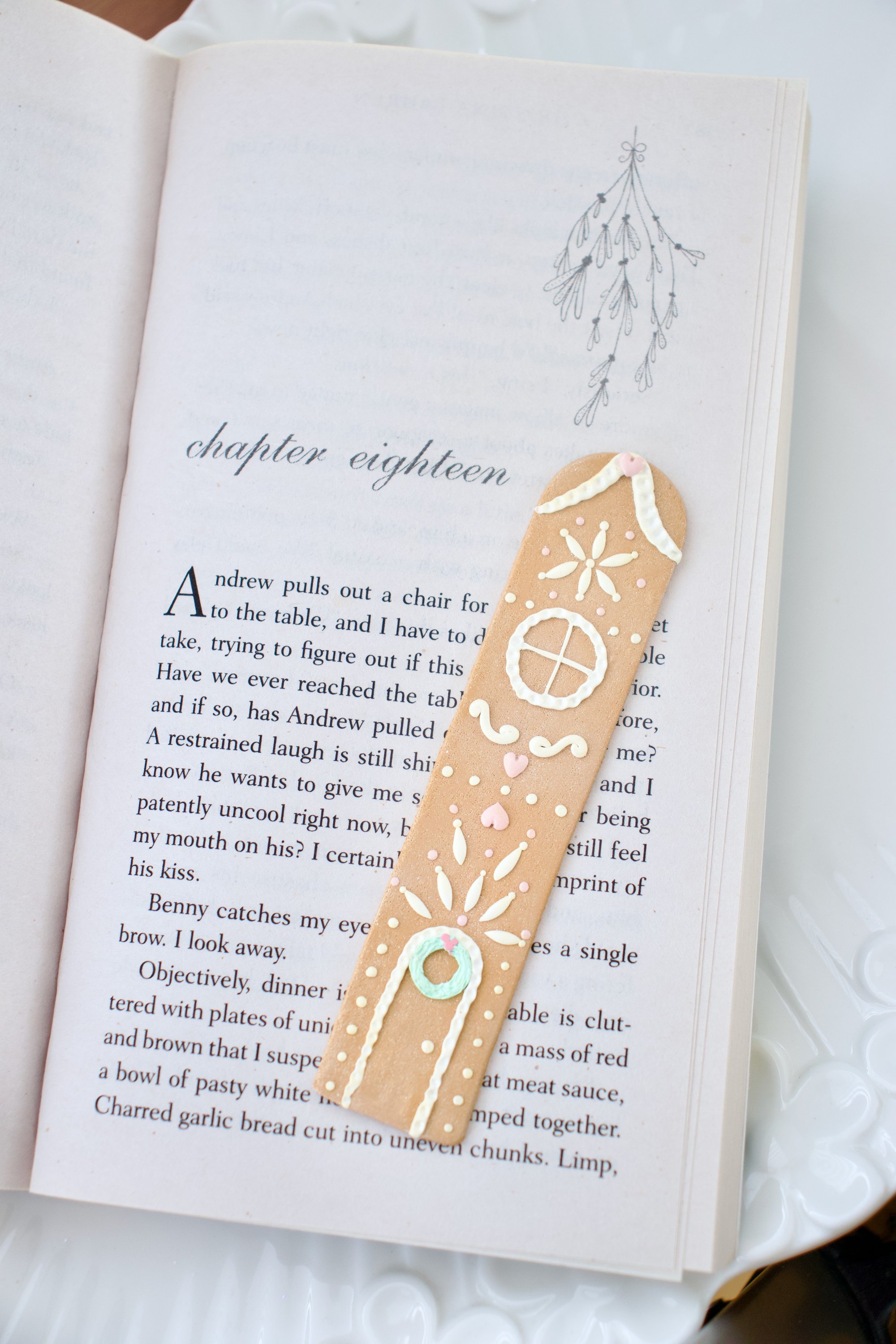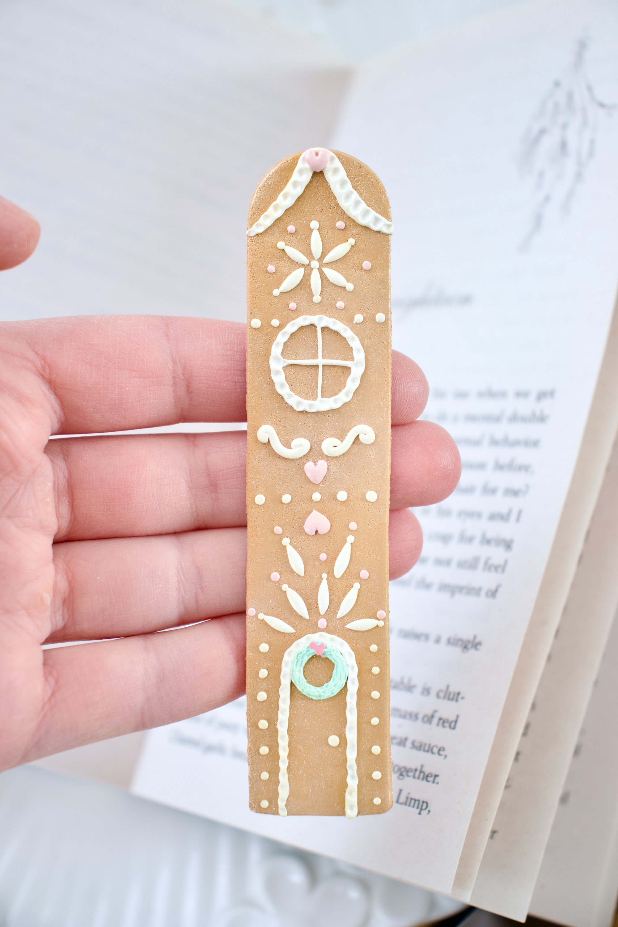 Upgrade your reading with this hand-sculpted polymer clay bookmark featuring a charming gingerbread house design with crisp icing details and a cookie-brown finish. It’s crafted with artisan-grade polymer clay — smooth, light-weight material that’s shaped, textured, and baked for long-lasting delight. It’s designed with a slim, slide-in form so it rests snugly between pages, adding a sweet touch of holiday magic to every read.